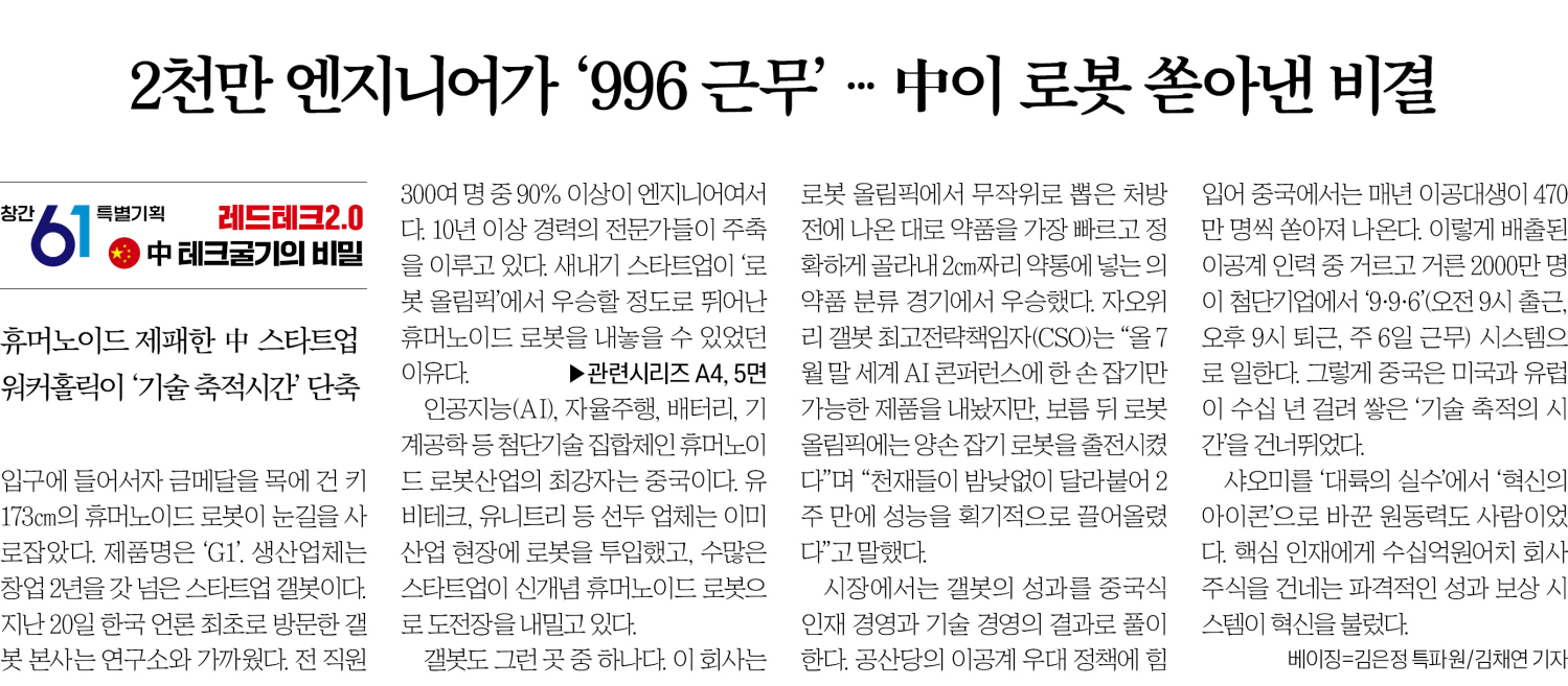 시장에서는 갤봇의 성과를 중국식 인재 경영과 기술 경영의 결과로 풀이한다. 공산당의 이공계 우대 정책에 힘입어 중국에서는 매년 이공대생이 470만 명씩 쏟아져 나온다. 이렇게 배출된 이공계 인력 중 거르고 거른 2000만 명이 첨단기업에서 ‘9·9·6’(오전 9시 출근, 오후 9시 퇴근, 주 6일 근무) 시스템으로 일한다. 그렇게 중국은 미국과 유럽이 수십 년 걸려 쌓은 ‘기술 축적의 시간’을 건너뛰었다.