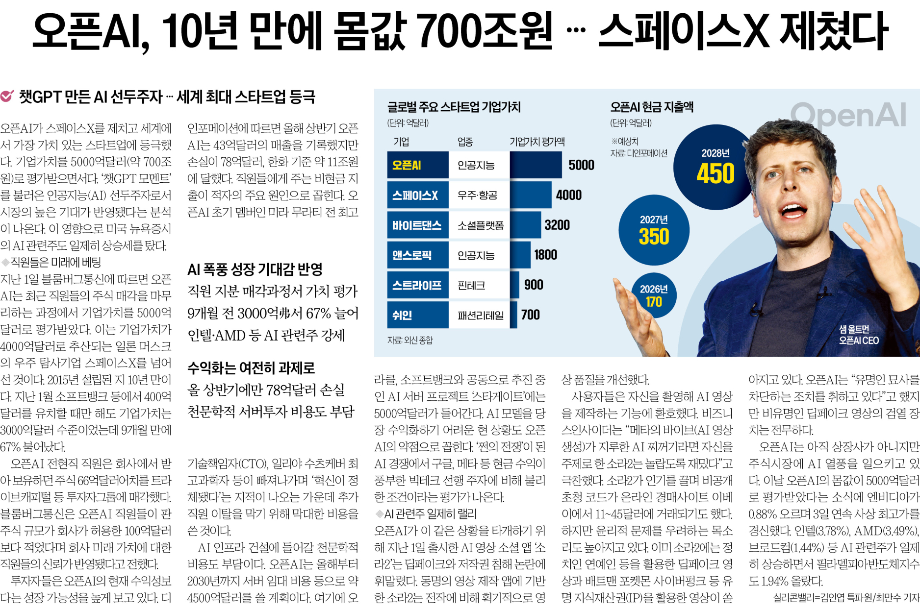 오픈AI, 10년 만에 몸값 700조원…스페이스X 제쳤다